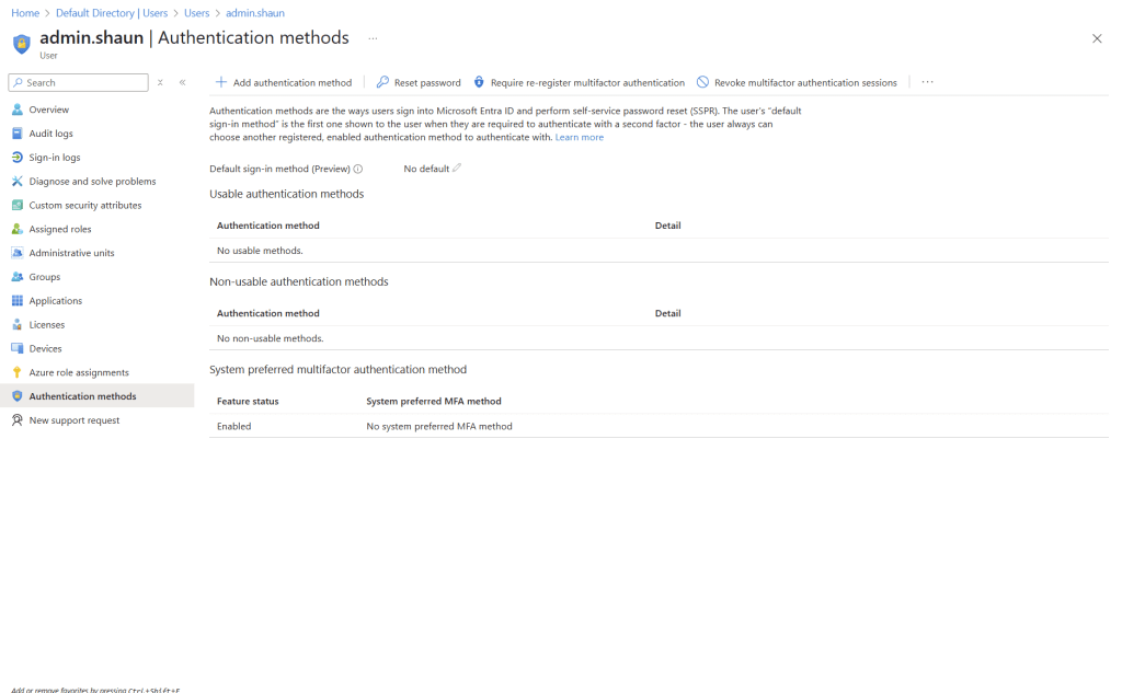 admin.shaun had no Multifactor Authentication (MFA) methods enabled, and no Conditional Access enforcing MFA.