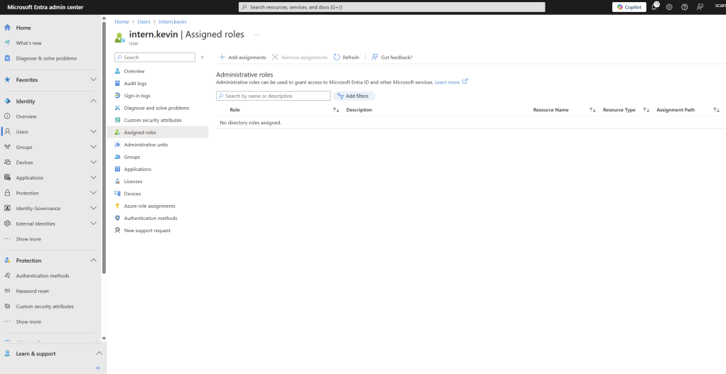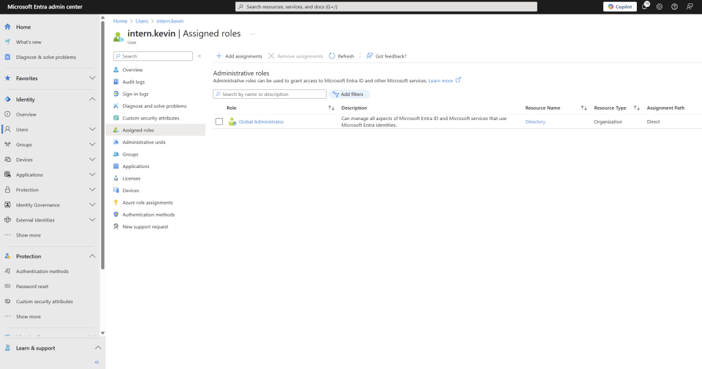 inter.kevin was assigned the Global Administrator role, the highest privilege role in Entra ID.