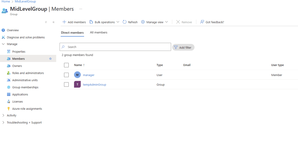 The manager user was only a member of the MidLevelGroup. However, through nested groups, this membership eventually lead to Storage Blob Data Contributor access.